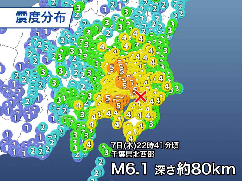 昨夜、大きな地震がありました。 22時41分頃、千葉県北西部を震源とするマグニチュード6.1、 深さ約80kmと
